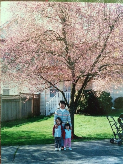 一路在社区走着,快到家的一个转角口,一户人家的前院是一个九十度的扇形院子,沿着边种着六棵粉红色的李花正盛开着,是这里春天时第一种开花的花树,每次在盛开经过时,总会想起什么叫“烟花三月”,那是一个很喜欢的转角。我还记得孩子很小时,有一天送儿子上学后,路经这个转角,走到树下,看着满树的花正开着,便请路过的邻居帮我和两个女儿拍照。大女儿才到我的腰部那么高,小女儿更是得微弯着腰才能握住她的小手,照片里还有那辆可以同时坐两个小孩的推车。