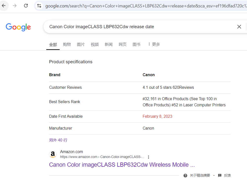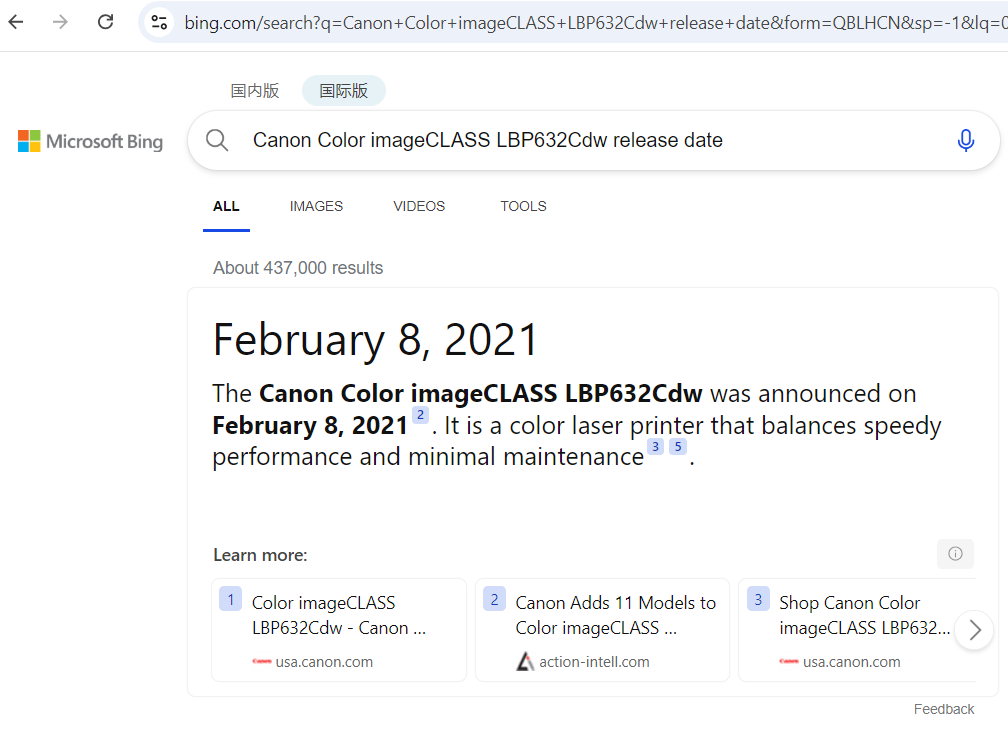 | 查找一种电子产品的首推时间应该算是不太难的任务。但是我发现人工智能在这个方面的表现并不是太好。用ChatGPO 4o查的效果也不佳。 Q: what is the release date for Canon Color imageCLASS LBP632Cdw? ChatGPT: The Canon Color imageCLASS LBP632Cdw was officially released in 2020. This model is a compact color laser printer designed for home offices and small businesses, offering features like wireless printing, duplex printing, and support for mobile printing options. Q: Are you sure? can you provide a cite for this? ChatGPT: It seems like I can’t do more browsing right now. Please try again later. However, based on my knowledge, the Canon Color imageCLASS LBP632Cdw was indeed released in 2020, but for the most accurate and updated information, I recommend checking official Canon press releases or their product page. 过了一天,我再次询问ChatGPT 4o, 答案依然不理想: Q: Could you double check the release date for Canon Color imageCLASS LBP632Cdw? ChatGPT: It seems like I can’t do more browsing right now. Please try again later. However, based on my knowledge, the Canon Color imageCLASS LBP632Cdw was released in 2018. For the most precise and up-to-date information, I recommend checking Canon's official website or a trusted retailer's product page. 维基百科有一个网页,List of Canon Products. 但目前所列出的打印机系列并不完整,没有包括我所要查找的这一机型。 微软的bing.com的国际版界面带有AI检索功能,所给出的答案是2021年2月8日,而且带有资料来源链接。但是根据这一资料来源,答案应该是2023年2月8日。 倒是谷歌检索上的AI报告比较可靠,2023年2月8日。来源是Amazon.com上的产品网页。 虽然亚马逊的网站在电子产品的release date报告上不一定都是正确的,但这个答案与Canon官网上的所查到的这一产品的发布日期是一致的。 这个例子刚好是我第一次用来测试DeepSeek,姑且记录一下。不过从这个简单的例子里,还看不到这个AI工具是不是特别的牛。 |