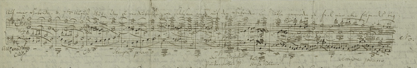 Music Division of the New York Public Library for the Performing Arts)。下面是门德尔松在这封信中手写曲谱的照片: 《芬格尔岩洞序曲》(Die Fingalshöhle, Op. 26)又名《赫布里底群岛序曲》(Die