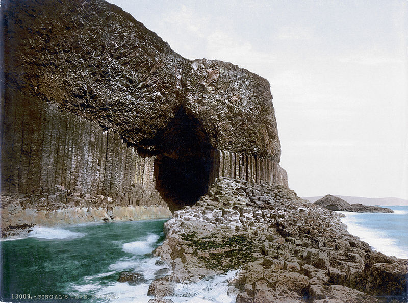 芬格尔岩洞以一位传说中的英雄命名,坐落在无人居住的斯塔法小岛上。“斯塔法”据说是荷兰语“石柱”的意思,因为在岛上及岩洞中有无数天然形成的石柱,景象奇异而壮观。下面是芬格尔岩洞洞口及洞内的照片: 据克林格曼事后写道:“我们乘船驶去,紧贴着呼啸的大海攀登一个个石柱桩子进入芬格尔岩洞,其绿色无比的海水咆哮着涌入洞穴,从没有见过比它更稀奇古怪的景象了。一根根石柱可以比做一架巨型管风琴,在黑暗中轰鸣