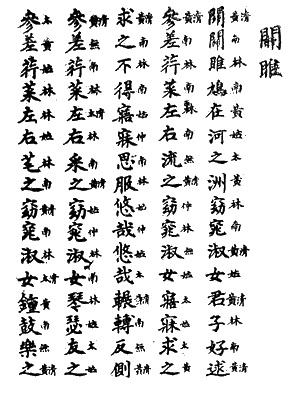 ************************************************************************ 律吕谱是一种用十二律名来记录音高的乐谱。今天保存最早的一种律吕谱宋代相传唐开元十二风雅诗经谱,也是现存最早的诗经乐谱。下面是第一页。关于中国古谱的知识,可参考“乐谱学习的相关知识”:http://www.chaodikong.com/news/2006/1205/878.html 著名美籍华人学者赵如兰先生已经把前面这一套曲谱翻译成了五线谱,是她当年博士论文的一部分,已经出书,见: Song Dynasty Musical Sources and Their InterpretationRulan Chao PianHarvard University Press, 1967 - China - 252 pages |