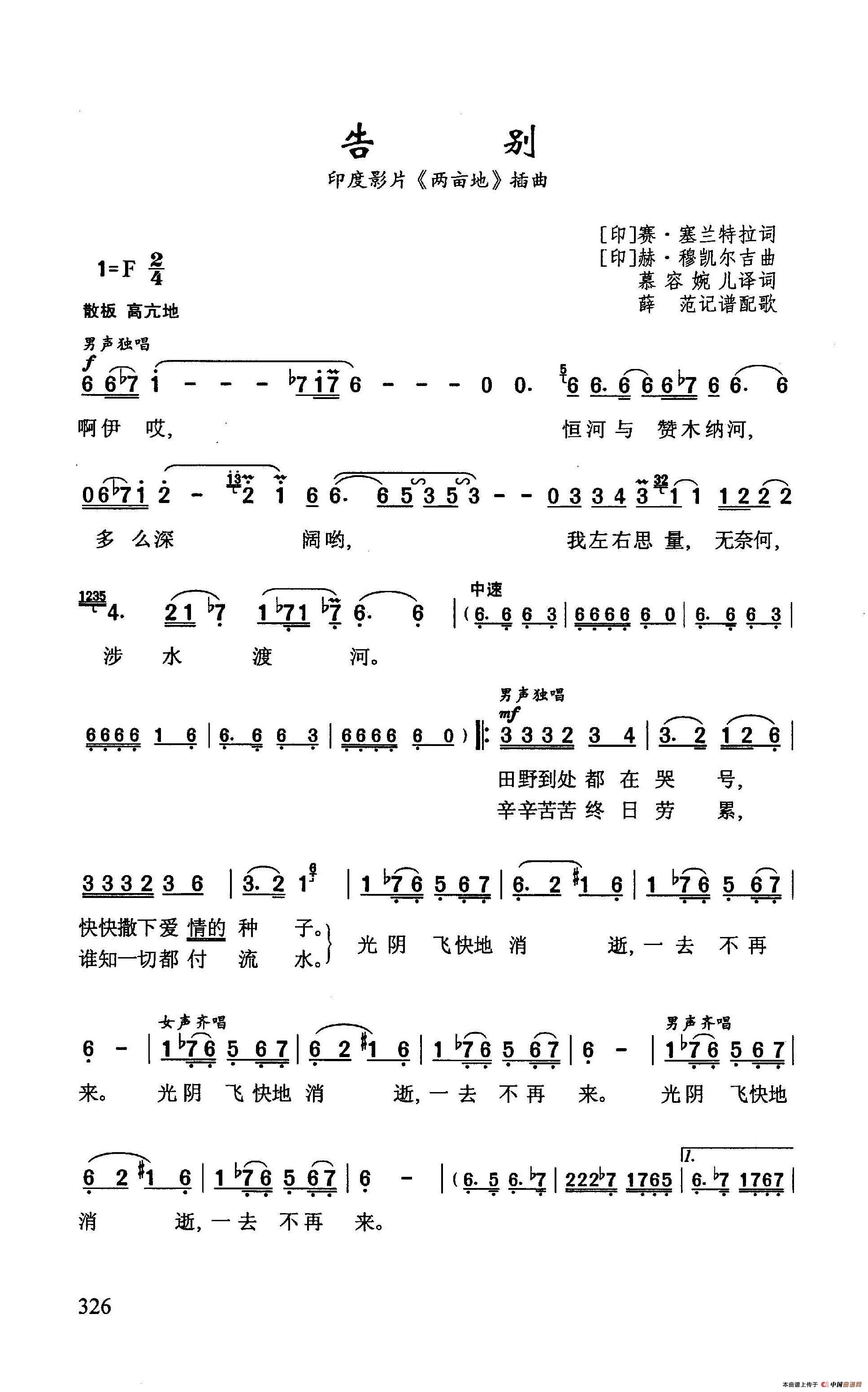 下面是薛范记谱配歌的歌曲“告别”的曲谱: