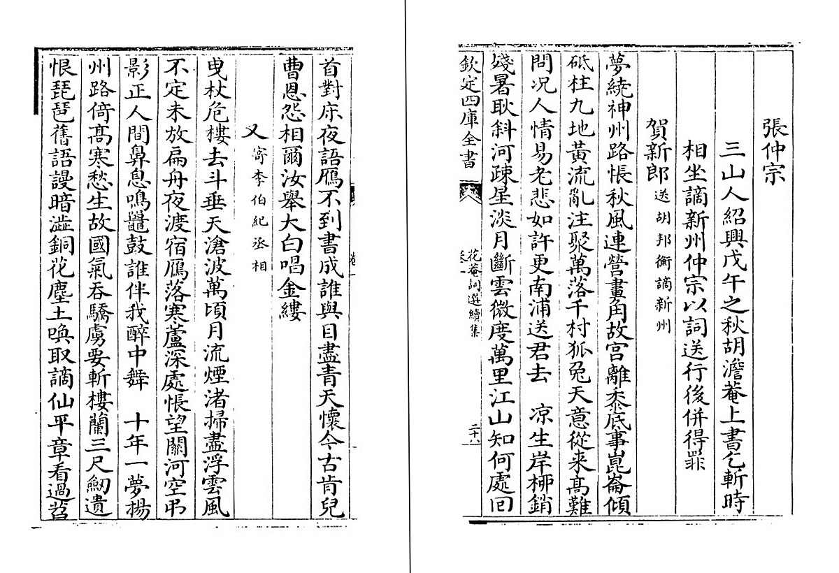 《四库全书》中所收录的《诗人玉屑》一书为20卷本,所以看不到这个条目。但是我找到了1958年古典文学出版社初版、1961年中华书局上海编辑所重版,1978年上海古籍出版社重印的PDF版,有很好的版本与校勘记录。上面所引的文字,就是来自于这个版本。 为《诗人玉屑》写序的那位黄升,还编辑有《花庵词选》10卷与《花庵词选续集》10卷,书成于淳祐己酉(1249年)。这部词集被收录在《四库全书》之中,所以我们现在可以看到PDF版本。在《花庵词选续集·卷一》中,这句词写作:“况人情易老悲如许”。书影如下: 既然《诗人玉屑·中兴词话》中提到《挥麈后录》,我也从《四库全书·子部》中找到这本书。《挥麈后录》是《挥麈录》中的一部分,是南宋著名史学家王明清的一部史料笔记作品。《挥麈后录·跋》的纪年是紹熙甲寅(1194年),与张元干去世相距为30年。在《挥麈后录·卷十》中,可以找到与《诗人玉屑·中兴词话》所摘录的几乎完全一致的那段文字。也就是说,在《挥麈后录》中,这句词写作“况人生易老悲如许”。 南宋所编并包括南宋词人的词集,还有周密的《绝妙好词》一书。经查阅,该集中没有收录张元干的作品。 从南宋流传下来的这些资料中所看到这句词的写法,我们可以判断唐圭璋在《全宋词》中所采用的写法,来自于《花庵词选续集》。在我看来,这样做不仅合情合理,而且有根有据。 顺便也提一下,受到网友阿里郎兄提到了胡云翼选注《宋词选》的指点,我也考察了《宋词选》的一些来龙去脉。胡云翼为现代词学家,先后选编多部词集,其中包括1933年在亚东书局出版的《词选》与1962年在中华书局上海编辑所出版的《宋词选》,影响极广。2004年,华东师范大学出版社将这两部选集一同编入《胡云翼集》,题为《选词》。根据《选词》的PDF版,我读到胡云翼在《宋词选》的序言中曾经提过,他“曾参考夏承涛、邓广铭、唐圭璋、马茂元诸氏的著作与意见。”但是,在这两部选集中,这句词都是写成“况人情易老悲难诉”,而并没有提到过还有其他的写法。 目前我所看到的市面上流传的各种选本,好像都比龙榆生与胡云翼的选本出现得更晚一些。所以,从年代与流传上看,来自于《词综》的另外一种写法,也许就是在胡云翼的选本中得到了更为广泛的流传。 |