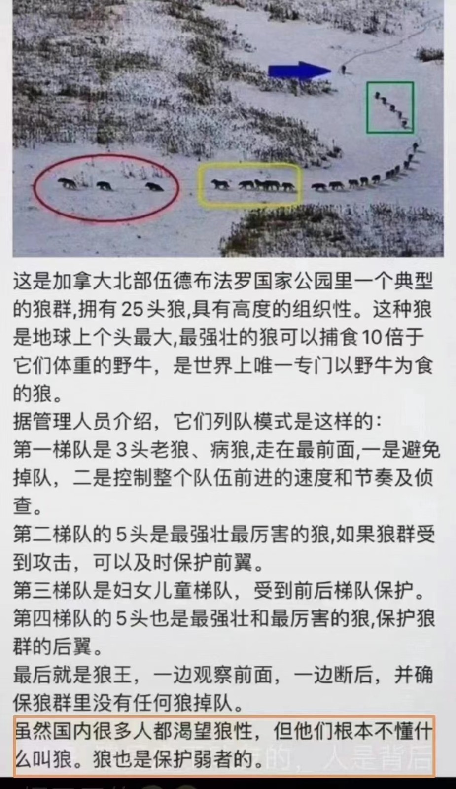 关于这张照片的出处与错误传播,已经有过不少纠错文章,我这里简单梳理一下。 首先必须记录一下,这幅图片的原始出处是2011年的英国《卫报》,文章的标题是:BBC Fronzen Planet-in pictures。原图的作者与说明如下: 2015年12月,这幅图片出现在意大利的脸书上,贴主的名字是Cesare Brai。据称,意大利文的说明文字把这幅图片当作无名作品,而且对其内容重新加以阐述,添加了许多原先图片说明中根本不存在的内容。几天之后,这个帖子被Babara Hermel Bach翻译成英文在脸书上再次贴出,引起了广泛的关注。不久,事实核查网站Snopes.com对此图片进行了调查,发表了第一篇纠错文章:Do the Oldest and Weakest Wolves Really Lead the Pack? Snopes.com的文章出来之后,脸书把上面提到的两个帖子都标注为错误信息。现在后一个帖子还在,前一个帖子已经无法查看了。据说整个账号消失了。 尽管如此,这个被篡改过的图片说明,似乎更符合某些培训团队的需要,因此一直在包括领英在内的各种社交媒体上流传。所以后来还不断出现带有不同标注的一些图片版本,以及随着也出现的文字帖子。 带有错误信息的中文版图片出现的确切时间还没有看到有效的记载。我找到的较早出现的纠错帖子,是《巅峰·培训网》2020年6月3日的一个帖子,狼性团队?很火的一张加拿大狼群照片被广泛误导传播。这个帖子用截图方式记录了不少信息。可惜这些截图现在已经无法查看了。稍后,台湾的事实核查中心网站也发表了一篇核查帖子,事实查核报告#552,时间是2020年7月14日。那么,可以判断这个中文版图片出现的时间不晚于2020年初。 目前我所能查到的最早这幅中文版图片的出处,是徐德文科学频道公众号2020年2月5日发表的一个帖子,题为《狼的领导力:老病狼靠前,妇幼狼居中,狼王断后,堪比人类军队!》。这篇文章采用了正确的摄影作者的名字。但是在内容上则采用了Babara Hermel Bach的说法,并且强调说,“这个解释并非我的独创,而是根据前人的解释丰富和发挥而来。至于说狼群究竟是不是这样想的,那就是仁者见仁智者见智了,欢迎讨论”。考虑到这个"徐德文科学频道"在许多社交媒体上都有账号在推广同一内容,它有可能是中文版本传播中的重要一个环节。 |